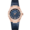 This 36 mm stainless steel and 18K Sedna™ gold model features a polished bezel set with 38 diamonds, a brown PVD treated dial with sun-brushed finish and a date window at the 6 o’clock position. The hands, OMEGA logo, Constellation star and indexes are all in 18K Sedna™ gold.