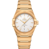 This 39 mm 18K Sedna™ gold model features a bezel engraved with Roman numerals, a silk-embossed blue dial and a date window at the 6 o’clock position. The hands, OMEGA logo, Constellation star and indexes are all in 18K Sedna™ gold.