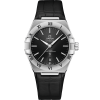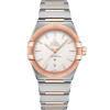 This 39 mm stainless steel model features a bezel with blued Roman numerals, a deep horizontally-brushed ruthenium-grey dial and a date window at the 6 o’clock position. The hands, OMEGA logo, Constellation star and indexes are all blued.