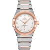 This 39 mm stainless steel and 18K yellow gold model features a bezel engraved with Roman numerals, a sun-brushed champagne dial with diamond indexes and a date window at the 6 o’clock position. The hands, OMEGA logo, Constellation star and diamond holders are all in 18K yellow gold.