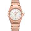 This 39 mm 18K yellow gold model features a bezel engraved with Roman numerals, an opaline white silvery dial and a date window at the 6 o’clock position. The hands, OMEGA logo, Constellation star and indexes are all in 18K yellow gold.