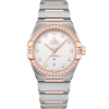 This 39 mm 18K yellow gold model features a diamond-paved bezel, an opaline silvery dial with diamond hour-markers and a date window at the 6 o’clock position. The hands, OMEGA logo, Constellation star and the diamond-holders on the dial are all in 18K yellow gold.