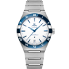 This 41 mm stainless steel model features a polished black ceramic bezel with Roman numerals in Liquidmetal™, a sun-brushed black dial and a date window at the 6 o’clock position. The hands, OMEGA logo, Constellation star and facetted indexes are all 18K white gold.