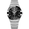 This 41 mm stainless steel model features a polished blue ceramic bezel with Roman numerals in “Grand Feu” white enamel, a white ceramic dial and a date window at the 6 o’clock position. The hands, OMEGA logo, Constellation star and facetted indexes are all blued.