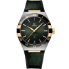 This 41 mm model, in stainless steel and 18K Yellow gold, features a brown polished ceramic bezel ring with Roman numerals filled with OMEGA Ceragold™. It has rhodium-grey dial with silk-embossed finish and a date window at the 6 o’clock position. The hands, OMEGA logo, Constellation star and indexes are also in 18K Yellow gold.