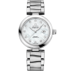 Radiating around the white pearled, mother-of-pearl dial, the bezel is also paved with snow-set diamonds, and an extra “Brilliant OMEGA cut” diamond has been placed within the polished crown.