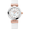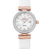 Radiating around the white pearled, mother-of-pearl dial, the bezel is also paved with snow-set diamonds, and an extra “Brilliant OMEGA cut” diamond has been placed within the polished crown.