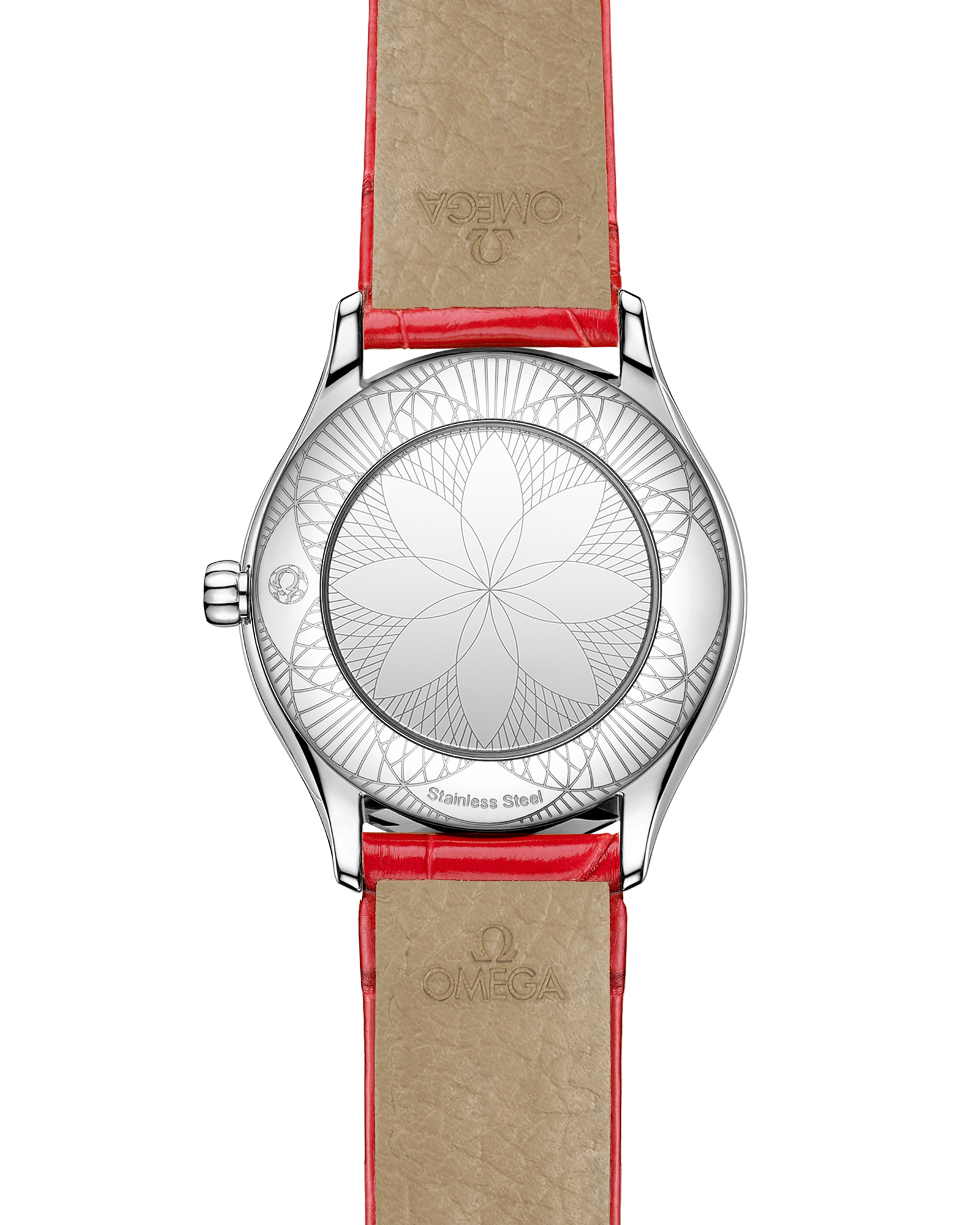 The watch is presented on a lacquered red alligator leather strap with a Trésor buckle. It is driven by the OMEGA calibre 4061, which sits behind a special mirrored caseback with a metallised “Her Time” pattern.