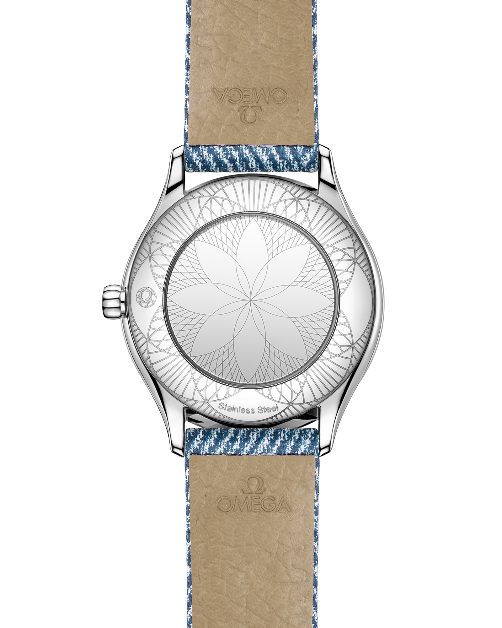 The watch is presented on a double-tour blue calfskin leather strap with a jeans pattern and a Trésor buckle. It is driven by the OMEGA calibre 4061, which sits behind a special mirrored caseback with a metallised “Her Time” pattern.