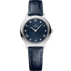 In this 27.5 mm stainless steel model, the PVD blue dial features a stamped random vertical pattern in a sun-brushed finish. The display is distinguished by rhodium-plated hands, as well as alternating Roman numerals and cabochon indexes. The pure look of the timepiece is completed by a full caseback embossed with a God Chronos medallion.