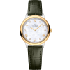 In this 27.5 mm stainless steel – 18K yellow gold model, the dial is crafted from white mother-of-pearl. The display is distinguished by yellow gold-plated hands, as well as alternating Roman numerals and cabochon indexes. The pure look of the timepiece is completed by a full caseback embossed with a God Chronos medallion.