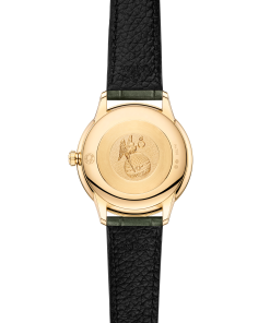 In this 27.5 mm 18K yellow gold model with its diamond-paved bezel, the dial is crafted from white mother-of-pearl. The display is distinguished by yellow gold-plated hands, as well as alternating Roman numerals and diamond markers. The pure look of the timepiece is completed by a full caseback embossed with a God Chronos medallion.