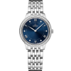 This 30 mm stainless steel model features a diamond-paved bezel and a PVD rose silvery dial with a stamped random vertical pattern in a sun-brushed finish. The display is distinguished by rhodium-plated hands, as well as alternating Roman numerals and diamond markers.