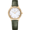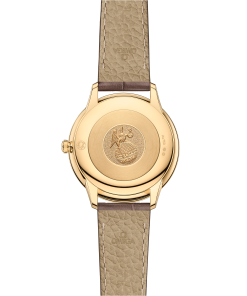 In this 30 mm 18K yellow gold model, the dial is crafted from white mother-of-pearl. The display is distinguished by yellow gold-plated hands, as well as alternating Roman numerals and diamond markers.