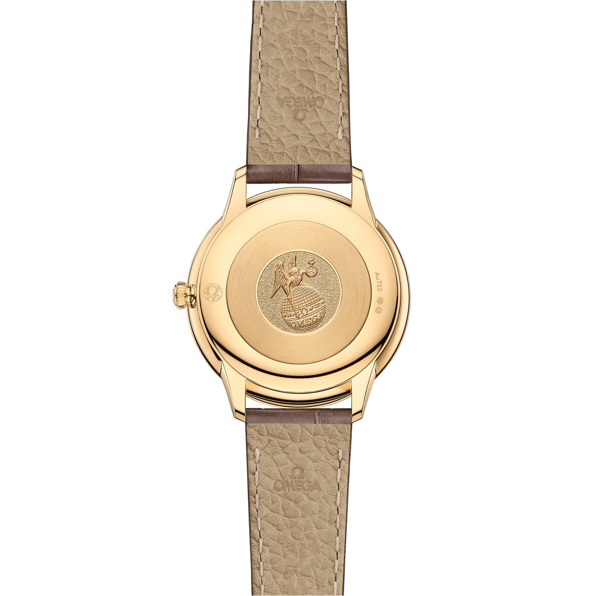 This watch is presented on a shimmering taupe brown leather strap and is driven by the OMEGA Quartz Calibre 4061, with a battery life of at least 48 months.