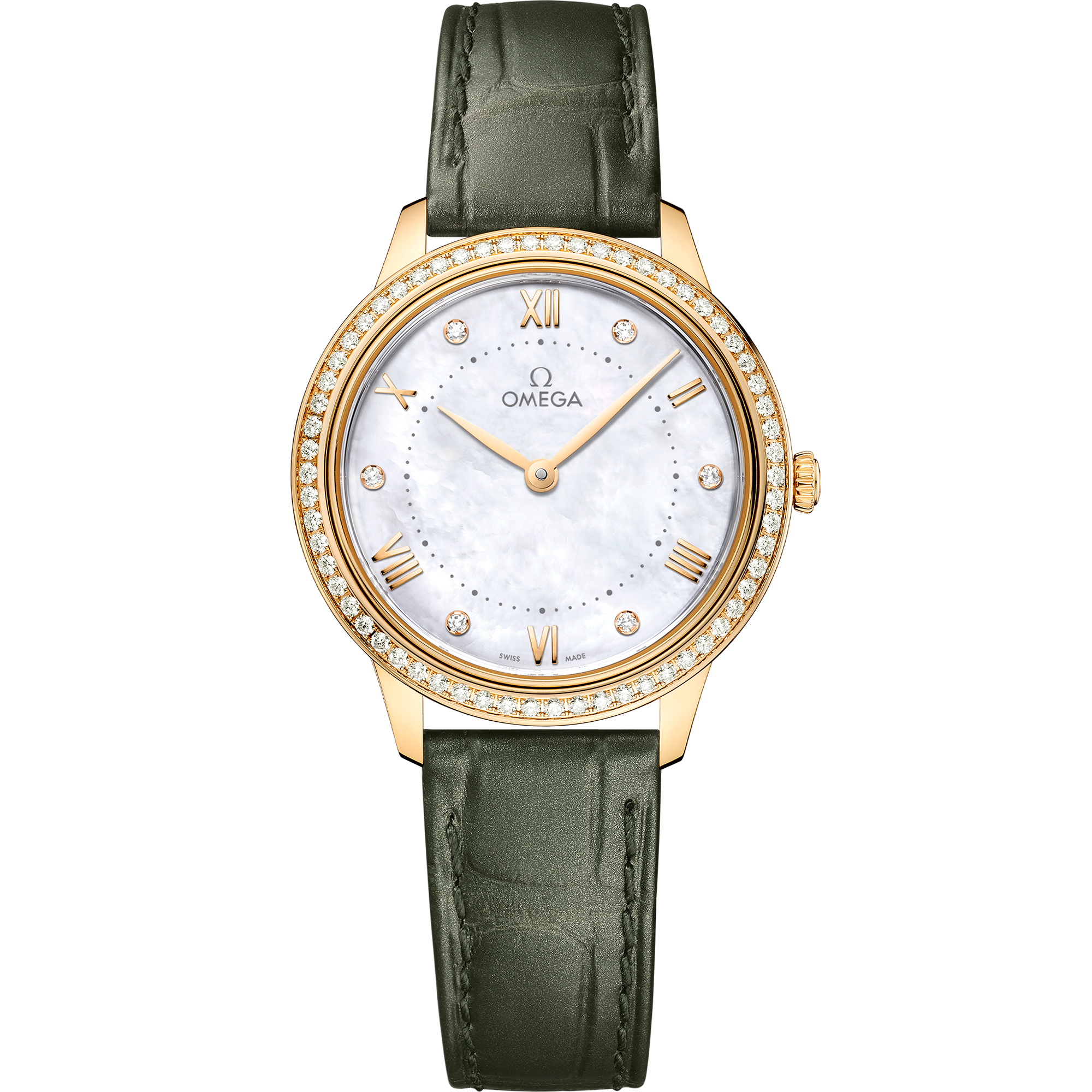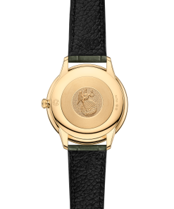 This watch is presented on a shimmering olive green leather strap and is driven by the OMEGA Quartz Calibre 4061, with a battery life of at least 48 months.