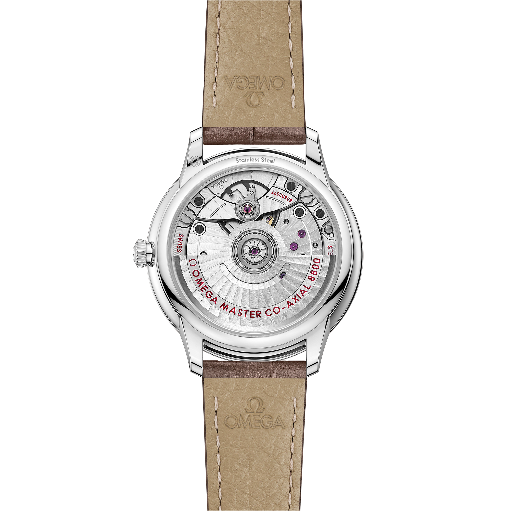 This Master Chronometer certified watch is presented on a shimmering taupe brown leather strap and is driven by the OMEGA Master Co-Axial Calibre 8800, which can be admired through the scratch-resistant sapphire crystal caseback.