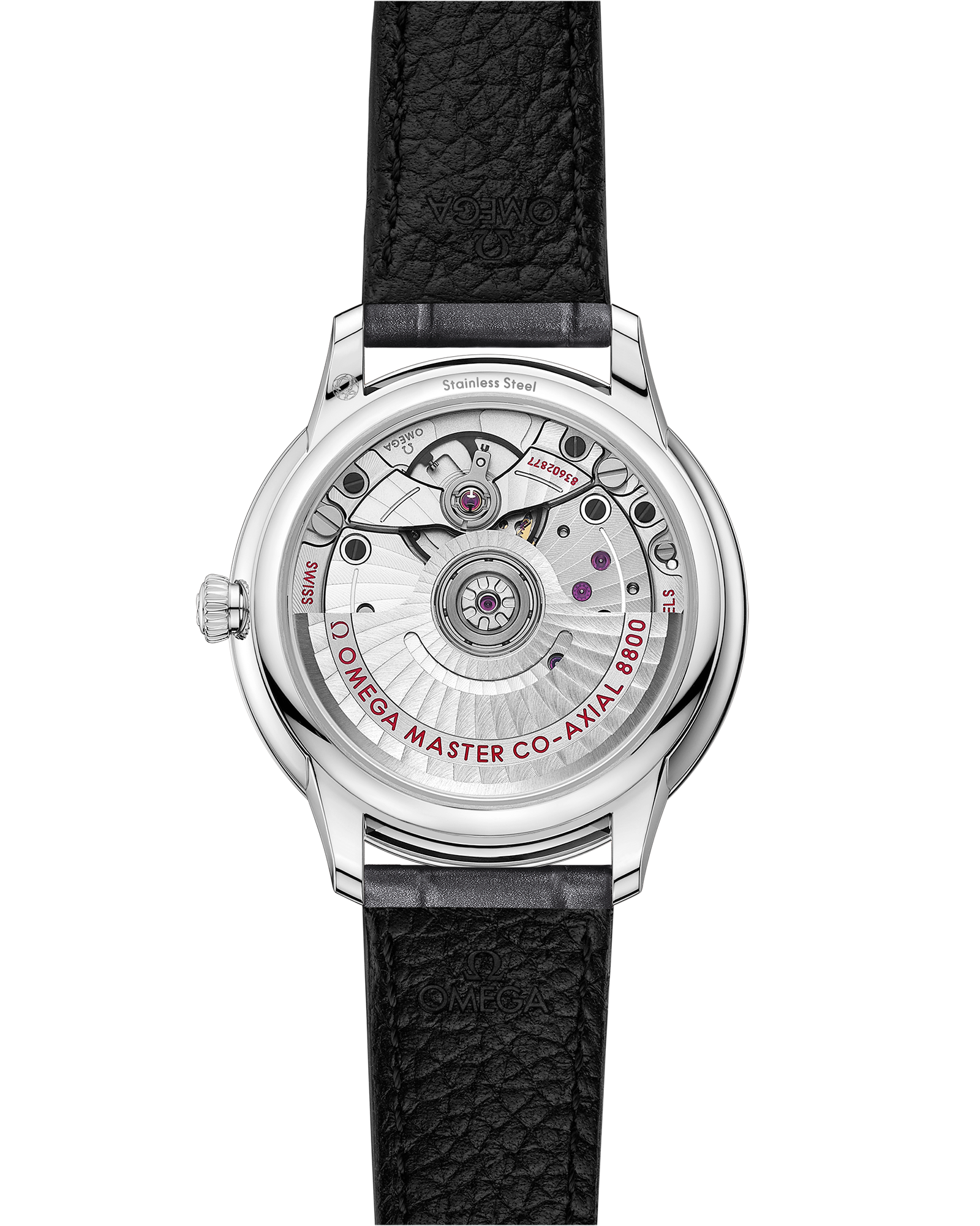 This Master Chronometer certified watch is presented on a shimmering dark grey leather strap and is driven by the OMEGA Master Co-Axial Calibre 8800, which can be admired through the scratch-resistant sapphire crystal caseback.
