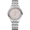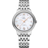 This 34 mm stainless steel model features a diamond-paved bezel and a PVD pine green dial with a sun-brushed finish. The display is distinguished by yellow gold-plated hands, as well as alternating Roman numerals and diamond markers.