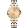 This 34 mm stainless steel and 18K yellow gold model features a diamond-paved bezel and a dial crafted from white mother-of-pearl. The display is distinguished by yellow gold-plated hands, as well as alternating Roman numerals and diamond markers.