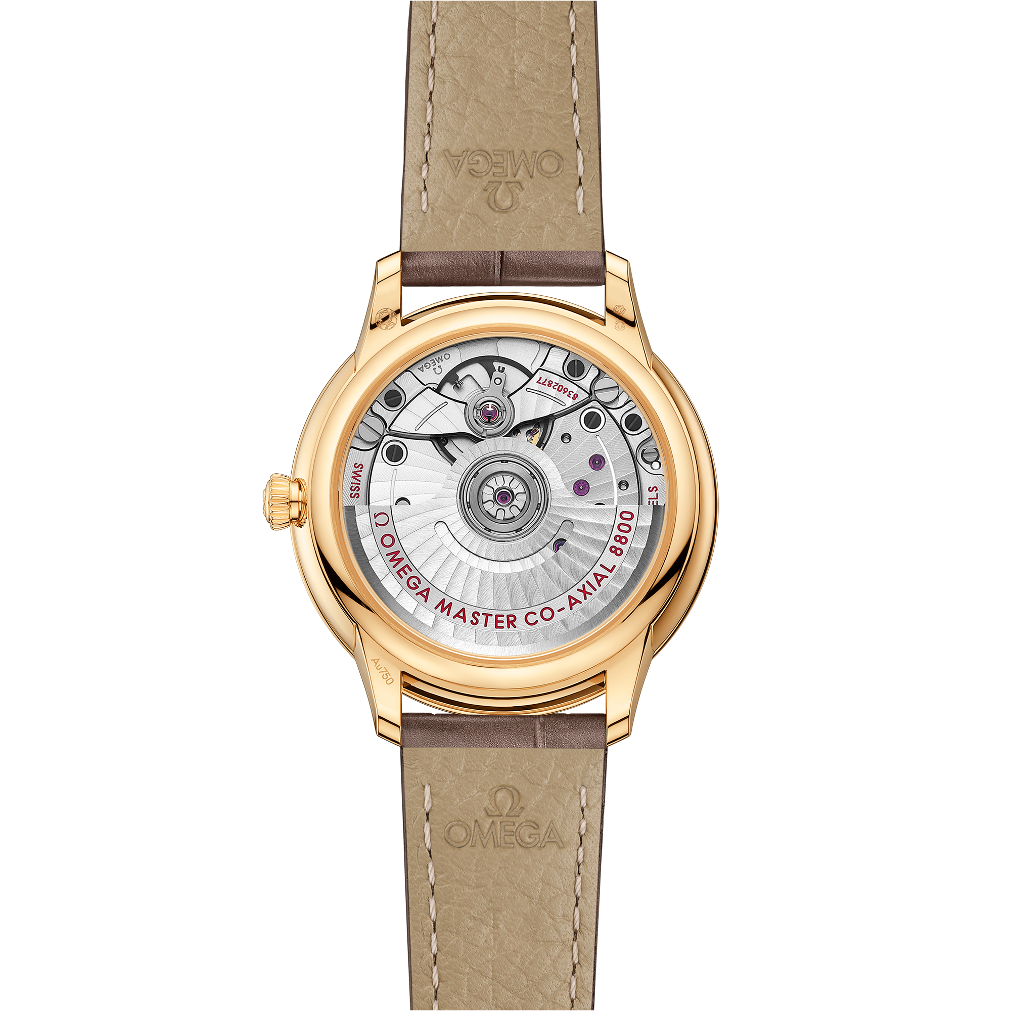 This Master Chronometer certified watch is presented on a shimmering taupe brown leather strap and is driven by the OMEGA Master Co-Axial Calibre 8800, which can be admired through the scratch-resistant sapphire crystal caseback.