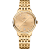 In this 34 mm 18K yellow gold model with its diamond-paved bezel, the dial is crafted from white mother-of-pearl. The display is distinguished by yellow gold-plated hands, as well as alternating Roman numerals and diamond markers.