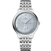 The pure look of the timepiece is completed by a date window at 6 o’clock, a small-seconds subdial at 9 o’clock, and a railway minute track on the outer zone.