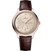 The pure look of the timepiece is completed by a date window at 6 o’clock, a small-seconds subdial at 9 o’clock, and a railway minute track on the outer zone.