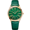 For this model, the slim 36 mm case is crafted in 18K Moonshine™ gold and features 38 full-cut diamonds, which curve elegantly along each side. The domed malachite dial includes applied and domed Roman numerals and diamond-polished hands all in 18K Moonshine™ gold, while the crown is engraved with an OMEGA flower, filled with red liquid ceramic and set with a single diamond.
