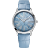 Crafted in polished stainless steel, the 36 mm case is set with 38 full-cut diamonds (0.49 ct), which neatly curve along each side. Beneath the domed sapphire crystal glass, there is a sand-blasted dial in PVD pink, which has been further embellished by a lotus pattern obtained through laser decoration. A single full-cut diamond has been placed in the crown, while the hands, indexes, and OMEGA logo are all rhodium plated.