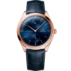 This model has a polished 40 mm 18K yellow gold case, which is presented on a grey leather strap. The domed crystal silvery dial includes a Power Reserve display at 12H, a Small Seconds display at 6H, along with hands and domed indexes in 18K yellow gold.