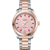 OMEGA’s beautiful 34 mm Seamaster has a symmetrical case in stainless steel and 18K Sedna™ gold and a polished diamond-set bezel. The pale pink wave-embossed dial has central hour/minute and seconds hands in diamond-polished 18K Sedna™ gold, a date window at 6 o’clock and 11 marquise-cut ruby hour markers.