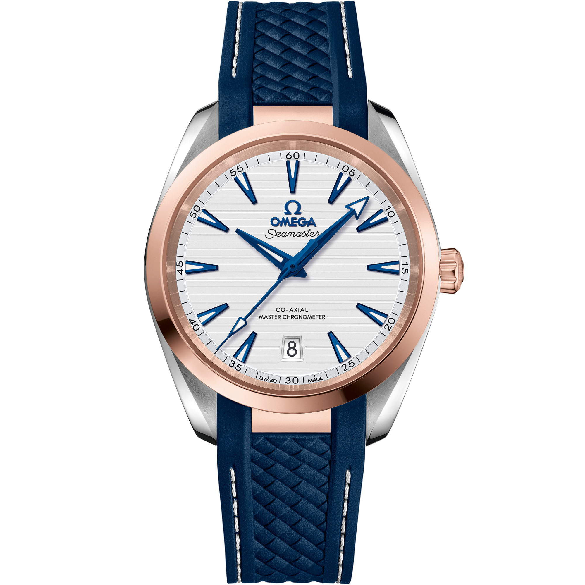 The blue strap is made from structured rubber and includes grey lining and an additional 18K Sedna™ gold link which integrates it to the case. This certified chronometer is powered by the OMEGA Master Chronometer calibre 8800, certified at the industry’s highest standard by the Swiss Federal Institute of Metrology (METAS).