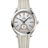 The sun-brushed blue-grey dial is distinguished by a horizontal “teak” pattern, along with a date window at 6H and an opaline Small Seconds subdial featuring a rhodium-plated ring. The design is further complemented by rhodium-plated hands and indexes filled with white Super-LumiNova, as well as sandblasted minutes and seconds tracks on the dial and subdial.