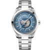 This 41 mm Aqua Terra, with a symmetrical case in polished and brushed stainless steel, has a blue rubber strap, which is integrated into the case and enhanced with a solid polished link in stainless steel.