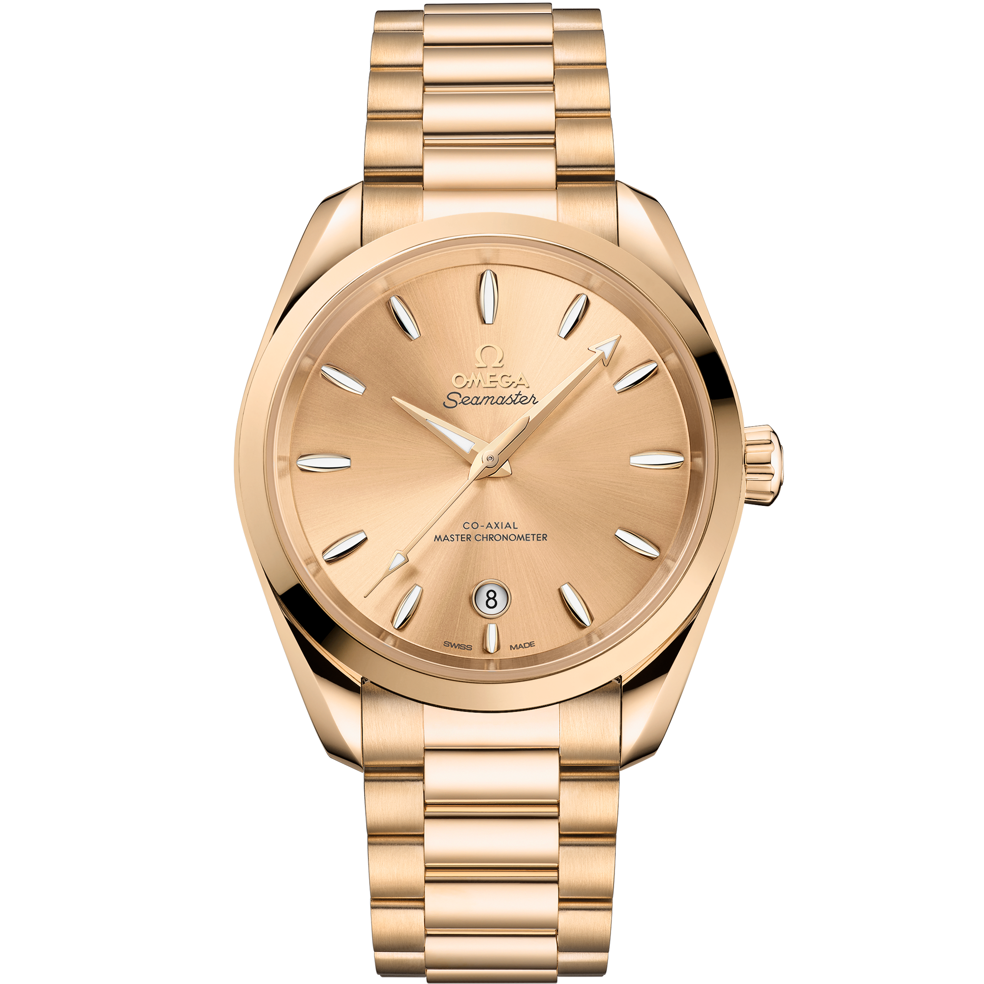 This 38 mm model, crafted in polished 18K Moonshine™ Gold, has a conical crown and wave-edged caseback with flat sapphire crystal. The sun-brushed and lacquered dial in PVD-treated Moonshine™ Gold, features a circular date window at 6 o’clock ringed in 18K Moonshine™ Gold. OMEGA has also used 18K Moonshine™ Gold for the facetted hands and distinctive hour-markers, which are shaped like sailboat hulls and filled with white Super-LumiNova.