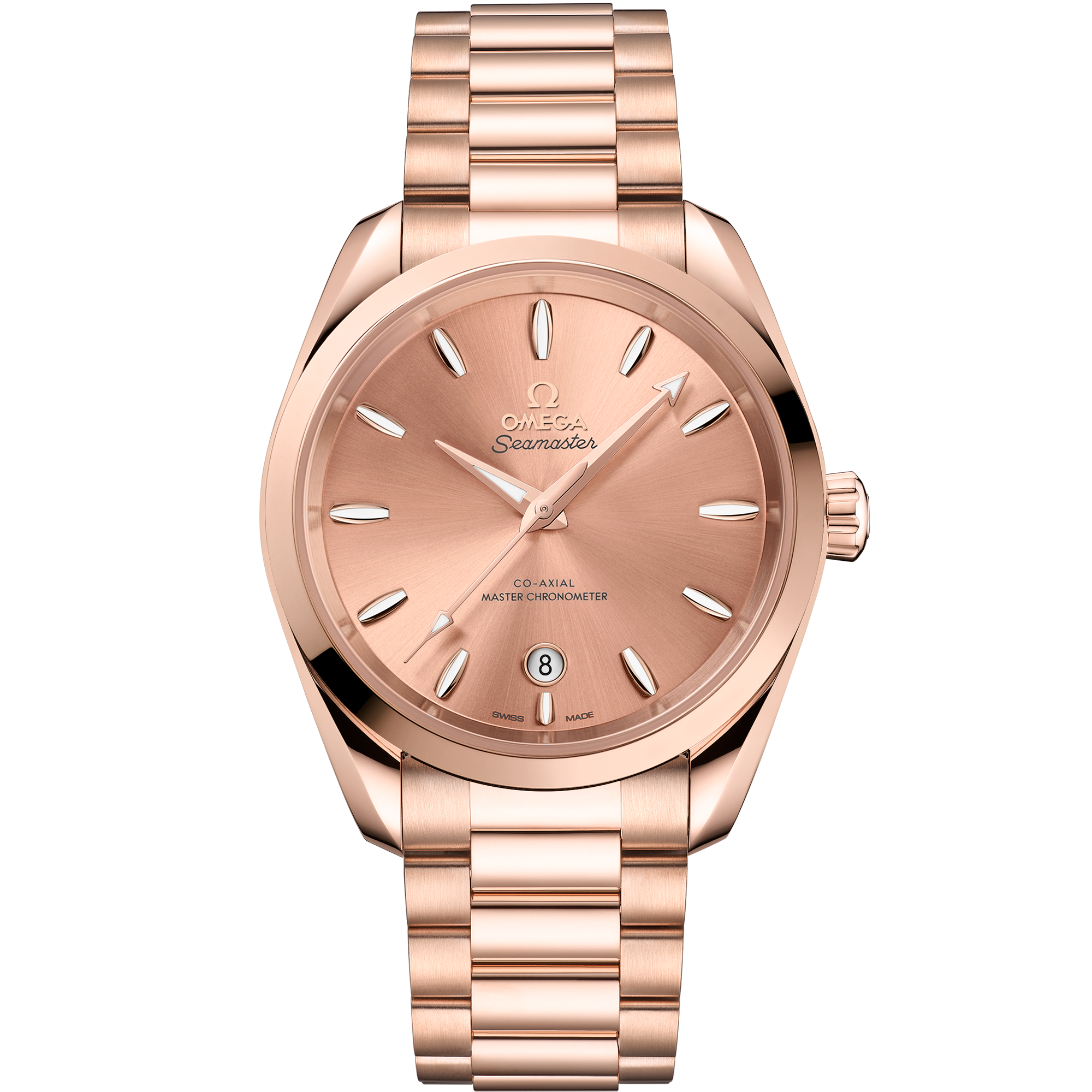 This 38 mm model, crafted in polished 18K Sedna™ Gold, has a conical crown and wave-edged caseback with flat sapphire crystal. The sun-brushed and lacquered dial in PVD-treated Sedna™ Gold features a circular date window at 6 o’clock ringed in 18K Sedna™ Gold. OMEGA has also used 18K Sedna™ Gold for the facetted hands and distinctive hour-markers, which are shaped like sailboat hulls and filled with white Super-LumiNova.