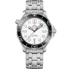 This 42 mm model is crafted from stainless steel and includes a black ceramic bezel with a white enamel diving scale. The dial is polished white ceramic and features laser-engraved waves and Seamaster highlighted in red.