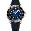 This 45.5 mm model in robust O-MEGASTEEL features a polished black ceramic bezel with its diving scale in Liquidmetal™. Through the protuberant and domed sapphire crystal, the lacquered gradient dial transitions from blue to black, and has been given 18K white gold hands and hour markers, which are all coated with white Super-LumiNova.