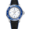This 45.5 mm model in robust O-MEGASTEEL features a polished blue ceramic bezel with its diving scale in white enamel. Through the protuberant and domed sapphire crystal, the lacquered white dial has been given four Arabic numerals in blue, as well as 18K white gold hands and hour markers, which are all coated with white Super-LumiNova.