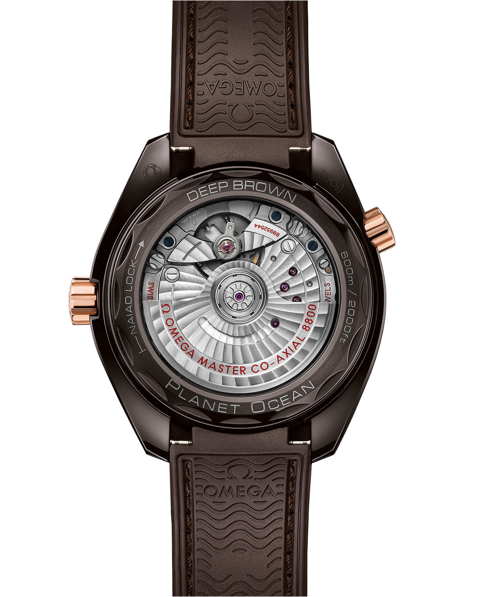 Presented on a quilted brown rubber strap, this timepiece includes the OMEGA Master Chronometer calibre 8800. This can be seen through the transparent caseback, which itself is enhanced by the NAIAD LOCK to keep all wording upright. To achieve Master Chronometer status, it has passed the 8 rigorous tests set by METAS (The Swiss Federal Institute of Metrology).