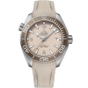 Powered by the Co-Axial Master Chronometer Calibre 8900, this Seamaster Planet Ocean is worn on an integrated dark grey rubber strap with a structured pattern and beige and dark grey stitching. The NAIAD LOCK caseback is completed with a metallized seahorse on the sapphire crystal.