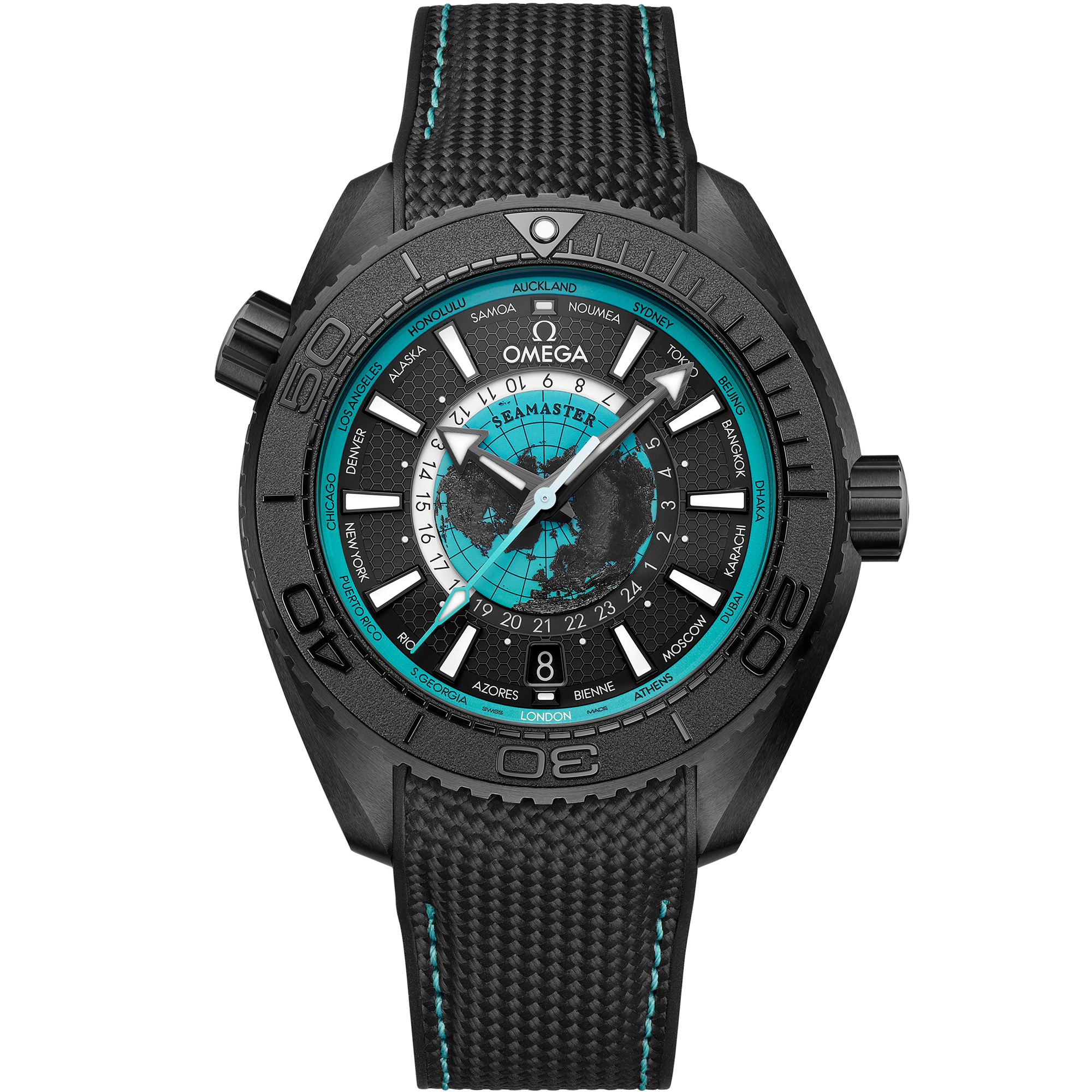 The outer section of the dial is produced in a DLC black colour with a laser-ablated and polished honeycomb pattern. It includes diamond-brushed indexes filled with white Super-LumiNova, and an outer ring in turquoise varnish. A variety of global destinations circles the dial and its outer ring, including OMEGA’s home city of Bienne, while the grey PVD coated hands also include white Super-LumiNova.
