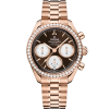 The brown PVD dial includes horizontal oval subdials with silvery coating and a vertical oval date window at 6 o’clock. The hour/minute hands, in diamond-polished 18K Sedna™ Gold, are filled with white Super-LumiNova which emits a green glow.