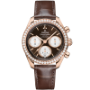 The brown PVD dial includes horizontal oval subdials with silvery coating and a vertical oval date window at 6 o’clock. The hour/minute hands, in diamond-polished 18K Sedna™ Gold, are filled with white Super-LumiNova which emits a green glow.