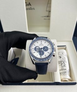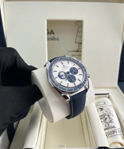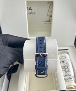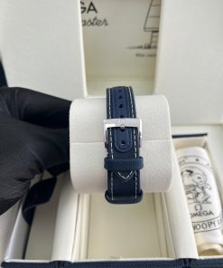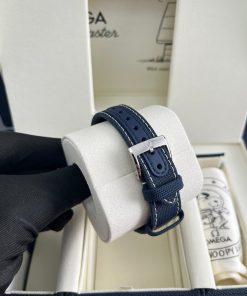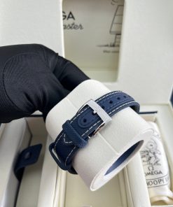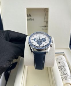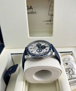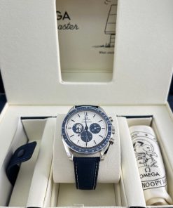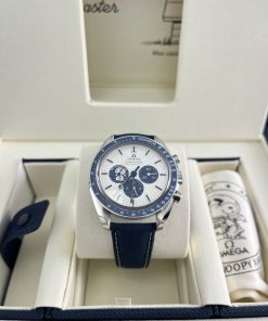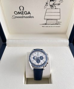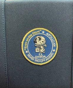 The 42 mm case in stainless steel is presented on a blue nylon fabric strap, which features the trajectory of the Apollo 13 mission on the embossed lining. The silver dial has blue PVD angle-shaped hour markers and hands, as well as an embossed silver Snoopy medallion on the blue subdial at 9 o’clock.