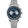 This 43 mm model is crafted in stainless steel with a blue dial with silvery subdials. Along with a blue anodized aluminium bezel ring with its tachymeter scale, the leaf-shaped hands and Arabic numerals are rhodium-plated, with a unique “spiral” track pattern running beneath the numbers.