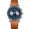 This 43 mm model is crafted in stainless steel with a blue dial with silvery subdials. Along with a blue anodized aluminium bezel ring with its tachymeter scale, the leaf-shaped hands and Arabic numerals are rhodium-plated, with a unique “spiral” track pattern running beneath the numbers.