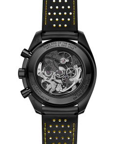In this 44.25 mm model, the Speedmaster’s history aboard the Apollo 8 mission is celebrated through the blackened movement, which is laser-ablated on the main plate and bridges to represent the moon’s surface. The near side can be seen through the skeletonized black anodised aluminium dial, while the far side can be seen through the caseback.