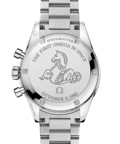 A vintage OMEGA logo is applied on the dial, as well as on the crown, while the caseback features the famous Seahorse medallion, and the engravings, “THE FIRST OMEGA IN SPACE” and “OCTOBER 3, 1962”.